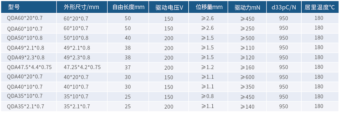 壓電雙晶片(驅(qū)動型) 利用壓電陶瓷的逆壓電效應,在電場的驅(qū)動下產(chǎn)生橫向位移的彎曲元件。結(jié)構(gòu)上采用兩片壓電陶瓷及高韌性彈性芯緊密粘接而成,在交變電源的驅(qū)動下產(chǎn)生相應的振動幅度,應用于微位移驅(qū)動裝置。
